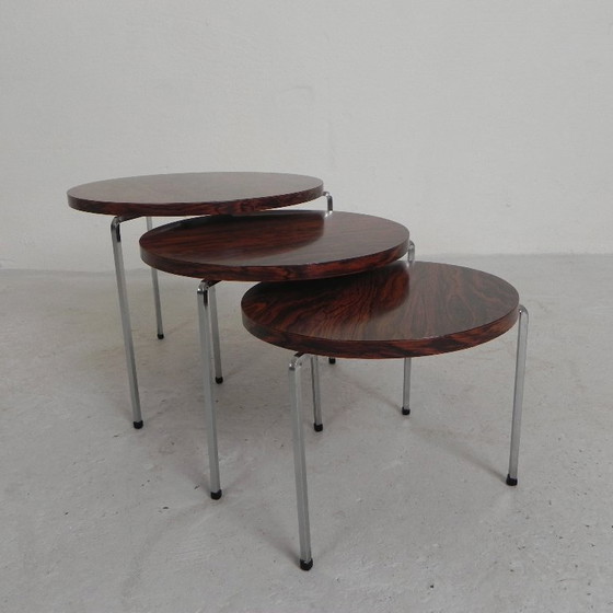 The smallest table is missing a very small piece of veneer in the edge (see detail photo).