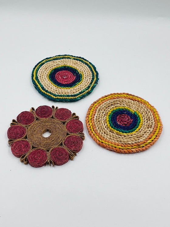 Each piece boasts meticulous braiding and a distinct design, creating a harmonious and decorative ensemble. Both functional and aesthetically pleasing, these trivets are perfect for protecting a table while adding a bohemian, handcrafted, and retro touch to your décor.