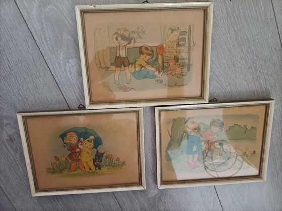 Bring a touch of nostalgia into your home with this beautiful set of three original children's prints, believed to be from the 1940s-50s, featuring lovely scenes of children playing, animals and domestic scenes. The illustrations are warm in color, with a soft pastel tone and charming details reminiscent of the style of Friedel Lüngen or similar German illustrators.