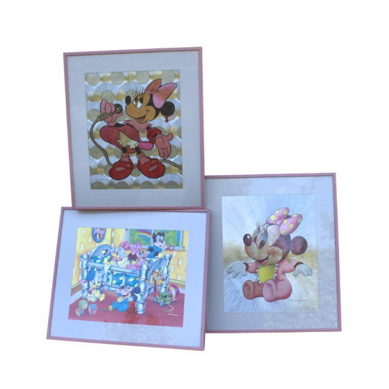 A beautiful set of three original Walt Disney frames, dated 1984. They feature a color-changing holographic print. The frames are made of pink metal with glass, and the print is hidden behind the glass. A perfect addition to your collection, home decor, or nursery. The price is for all three frames. This would be a real eye-catcher in your home.