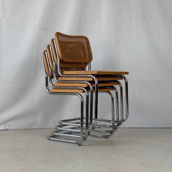 Set of 4 Marcel Breuer-inspired “Cesca” chairs from the 1980s, made in Italy. These chairs feature the classic tubular steel frame and cane or woven seats characteristic of the iconic Bauhaus design. They are in their original condition with a strong, stable structure, showing natural signs of age and use as seen in the photos.