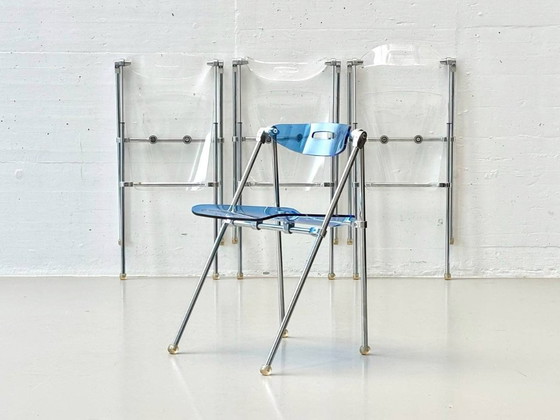 Condition: The four chairs are in good overall condition. The chrome-plated metal frames show only minor signs of age-related wear, without rust or significant scratches. The transparent acrylic surfaces are clean, with minor signs of wear in the form of fine scratches, which are typical for this material. The blue chair has a few dark inclusions in the material, presumably from the manufacturing process. The folding mechanism works perfectly on all chairs. The chairs appear well-maintained and are sturdy.