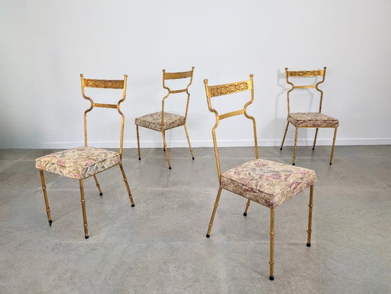 Elegant set of four wrought iron chairs with a striking gilt finish and sculptural silhouette. Made in Spain in the 1980s, each chair features a hand-worked frame with decorative detailing and a square seat upholstered in a floral tapestry fabric. One chair has a slightly lower backrest for some reason. The overall aesthetic blends classical inspiration with postmodern charm.