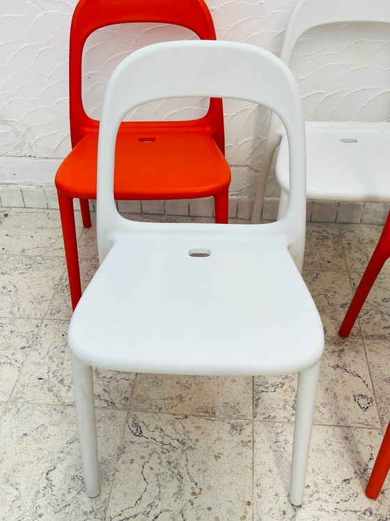 Made in Italy, with clean, modern lines typical of 2000s design. The set includes 2 white and 2 orange chairs, creating a striking and decorative graphic contrast.