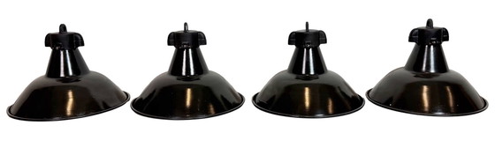 4 Industrial black enamel pendant lights made in former Czechoslovakia during the 1950s. White enamel inside the shade. Cast iron top. The porcelain socket requires standard E27/ E26 light bulbs. New wire. Fully functional. The weight of the lamp is 2 kg.The diameter of the lampshade is 38 cm.