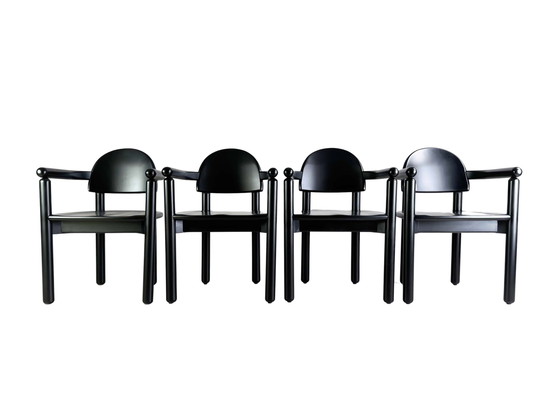 We are offering a set of 4 original vintage Rainer Daumiller armchairs from the 1960s for sale. The vintage chairs (originally only with clear lacquer in wood colors) have been professionally re-lacquered in black and are therefore a real eye-catcher in modern interiors. We have a total of 8 chairs in stock, whereby the price refers to the set of 4. A lower set price is possible when purchasing several pieces.