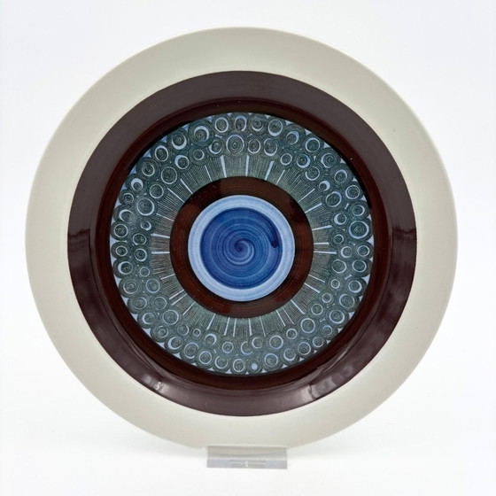 This medium-sized plate features the Amanda motif from the Swedish ceramic factory Rörstrand. The "Amanda" service was produced from 1968 to 1977 and is known for its hand-painted decor in brown and dark blue tones on a light blue background.