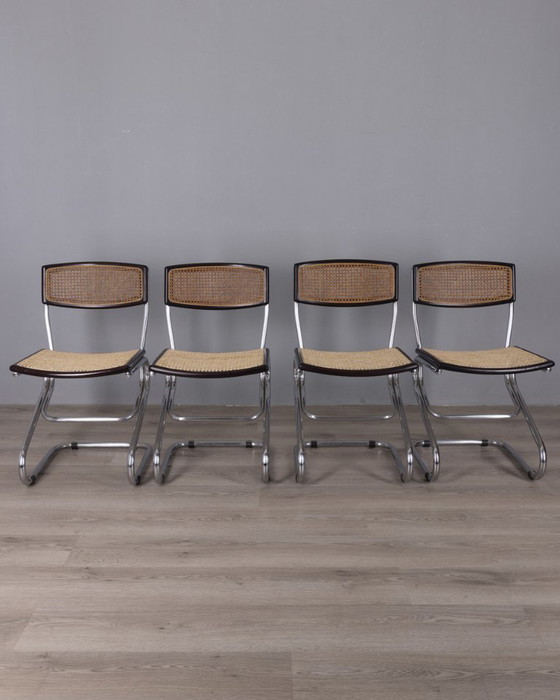 Set of four chairs with a chromed metal tubular frame and a wooden and cane seat, Italian design, 1960s.