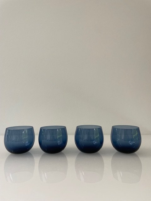 The glasses are hand-blown and finished in a beautiful transparent blue, typical of Scandinavian design. They lie comfortably in the hand and are perfect for cocktails, liqueurs or small desserts. Height 5.5 cm, diameter 7 cm, capacity approximately 100-120 ml.