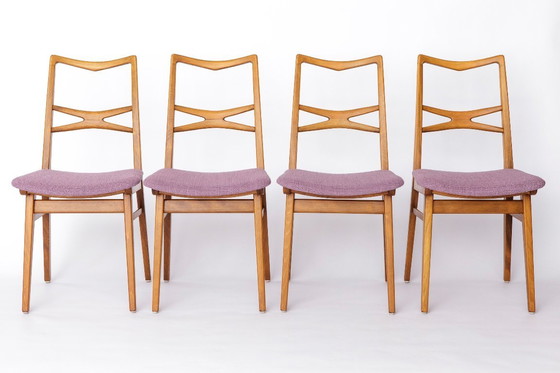 The seats have been newly reupholstered in a purple-toned fabric, adding a bold mid-century accent.