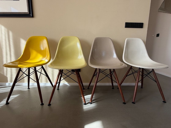 Beautiful set of 4 original fiberglass side chairs, designed by Charles & Ray Eames and produced by Herman Miller in the 1960s / 1970s.
