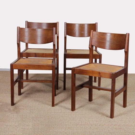 The chairs in this set are made of solid wood. The seat is straw-lined. This is French work dating from the 1980s. These vintage chairs are in good original condition.