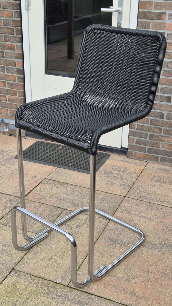 introduce a touch of retro charm to your interior with this set of 4 vintage Tecta D41 bar stools from the 1980s. These iconic stools feature a sleek metal frame paired with a stylish black wicker seat, making them perfect for any modern or classic kitchen.