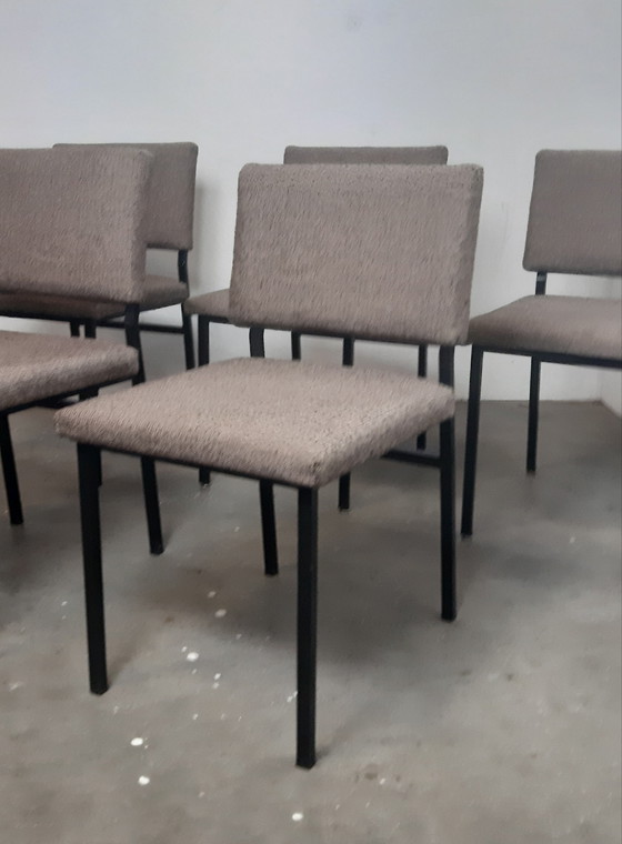 This set of five dining chairs, designed by Martin Visser for Spectrum, embodies the essence of Mid - Century Modern design. The chairs combine a sleek metal frame with comfortable textile upholstery in a warm gray hue, perfect for a stylish dining room.