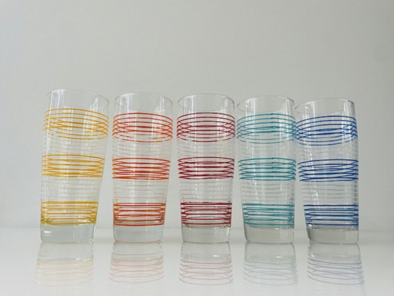 Set of 5 vintage Scandinavian long drink glasses with fine, colored stripe designs. Each glass has its own color accent, creating a playful look.