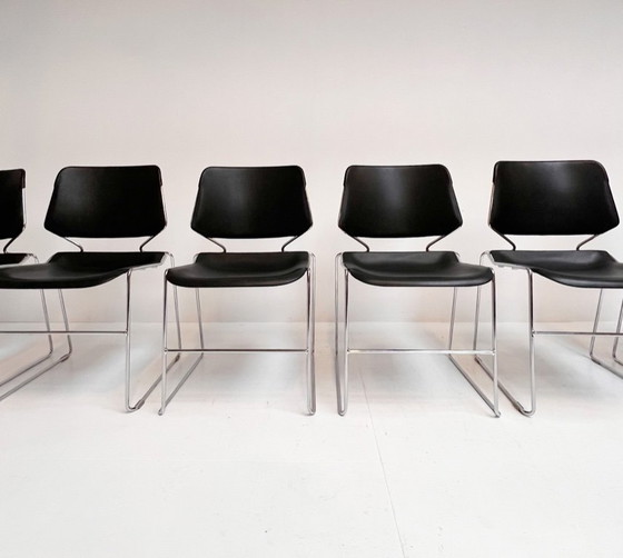 The stackable Matrix chair was designed by Thomas Tolleson in the 1970s and executed by the American firm Krueger. The chairs have a chrome tubular frame with a blue polypropylene seat and backrest. Spacious and comfortable, they are suitable for the home, office, or restaurant. A playful and colorful design. The metal has a light patina. Price is for a set of 6.