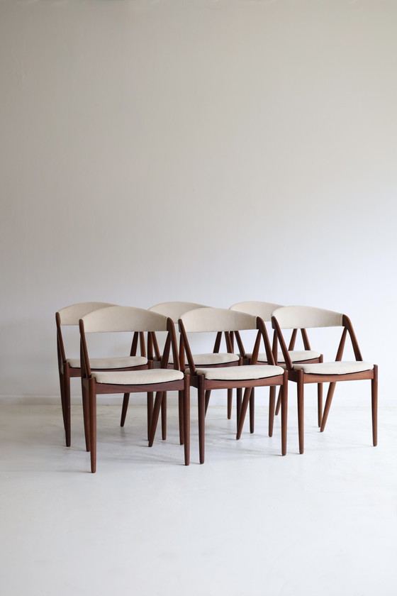 Set of 6 Model 31 dining chairs designed by Kai Kristiansen in the 1960s for Schou Andersen Møbelfabrik. This set has been reupholstered and is in very good condition.