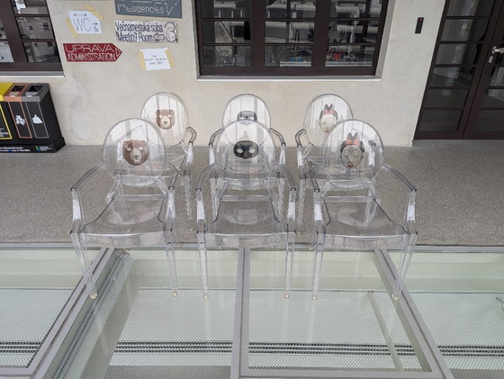 Elevate your space with this rare and collectible set of 6 Louis Ghost chairs, designed by Philippe Starck for Kartell. These iconic transparent polycarbonate chairs blend classic baroque inspiration with modern innovation, making them a striking addition to any contemporary or eclectic interior.