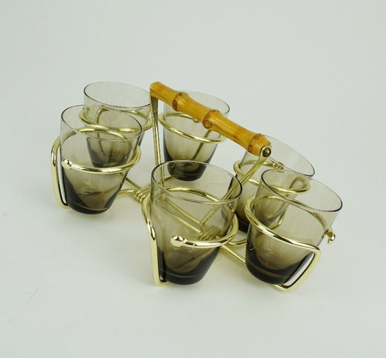 Exceptionally beautiful set of glasses from the 1950s. Brass wire frame with bamboo handle, 6 smoke colored shot glasses.