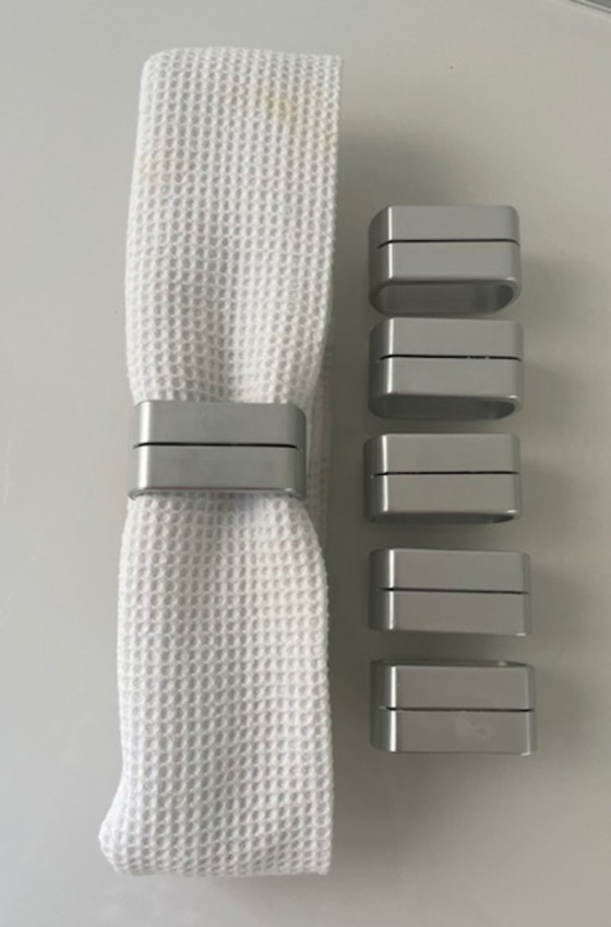 Sleek set of 6 napkin rings made of polished aluminum. The minimalist, geometric design gives any table setting a modern and sophisticated look.