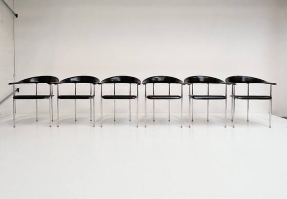 RESERVED. This set of P40 chairs by Giancarlo Vegni and Gianfranco Gualtierotti for Fasem is a striking eye-catcher. An ergonomic design from the 1980s that also steals the show. The designer chair has a chromed steel frame and is upholstered in high-quality black saddle leather. The set is in excellent condition with very minor signs of wear. It rests on rubber floor caps and is marked in the leather on the underside of the chair.