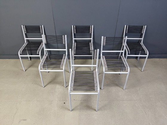 Vintage grey metal dining chairs with elastic cords designed by rene Herbst in the bauhaus period and produced in the 1980s