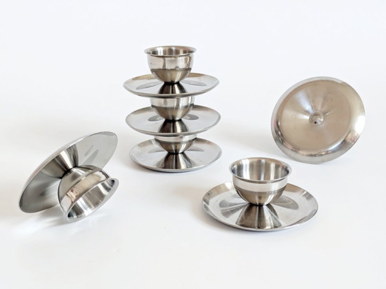 This elegant set of six vintage egg cups was produced by Polaris in Norway and features a sleek Scandinavian modern design. Crafted from brushed stainless steel, each piece combines a small egg holder with a built-in saucer, creating a clean and practical form.
