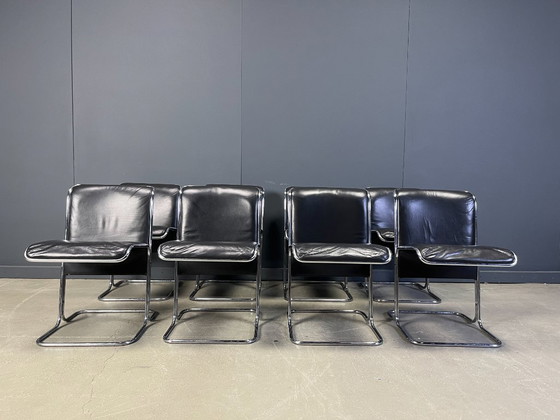 ConditionVery goodColorsSilverMaterialChrome, LeatherNumber of items8Height75 cmWidth45 cmDepth53 cmSeat height45 cmSigns of usageScratches
