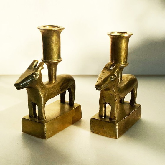 Set of antique brass candlesticks, animal figures
