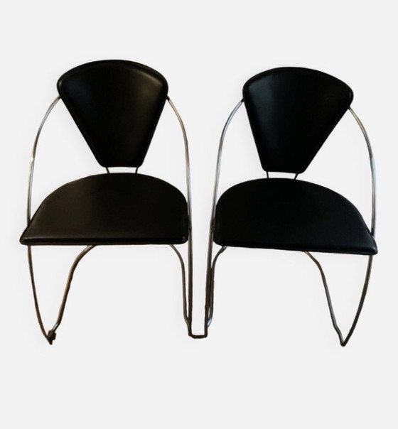 Four vintage steel and leather FIL dining chairs Sled legs. Chrome-plated steel base. Practical and versatile modern design. Seat height 43 cms. Dimensions 49/80/54 cms.