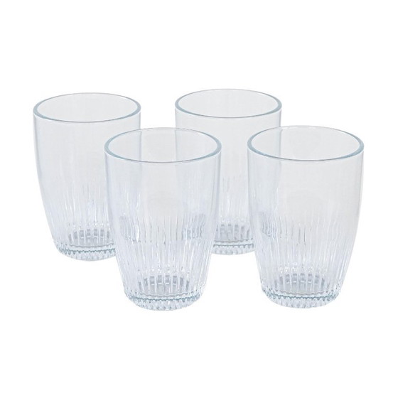 A set of 4 vintage glasses made of transparent glass with a vertical, cut pattern. Their elegant and simple form makes them perfect for both everyday use and special occasions.