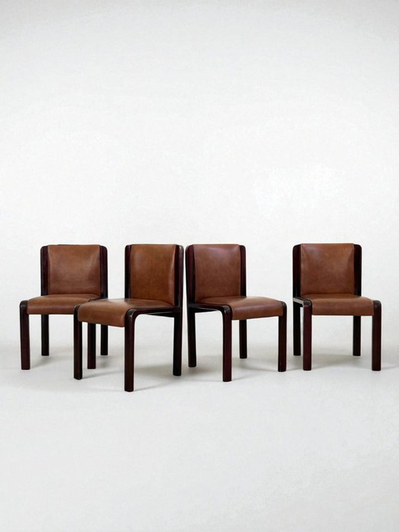 Set of 4 chairs. These chairs exemplify a sense of functional design. The leather seat and backrest are padded within a modest wooden frame.