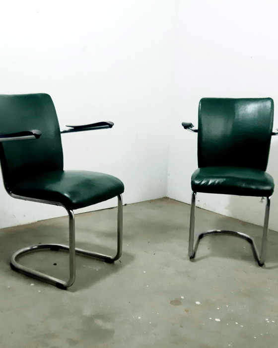 This set of two Gebroeders de Wit armchairs from the 1950s embodies the elegance and functionality of mid-century design. With their clean lines and timeless look, these chairs add a touch of vintage charm to any interior. The armchairs are upholstered in rich green upholstery for a refined look, while the chrome frame adds a modern touch. These chairs are not only visually appealing but also offer excellent seating comfort, ideal for both living and working spaces. - Iconic 1950s design by Gebroeders de Wit - High-quality green upholstery with a durable chrome frame - Perfect for both modern and classic interiors Add this beautiful set to your collection and enjoy the unique combination of style and comfort.