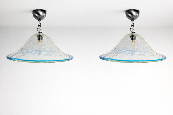 This set of pendant lamps from La Murrina, made in Italy, exudes refinement and elegance. The transparent glass shades with blue accents create a unique light distribution that enhances any room. Perfect for above the dining table or in the living room, these lamps add a touch of Italian style to your interior.