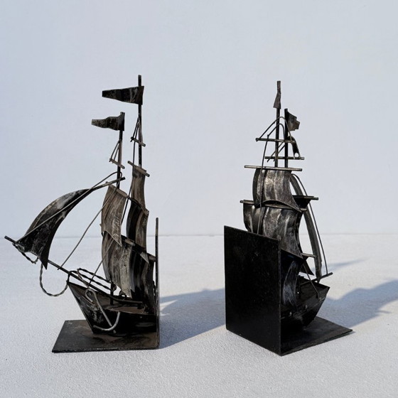 A set of handmade sailing ship bookends made of iron. Beautifully crafted.