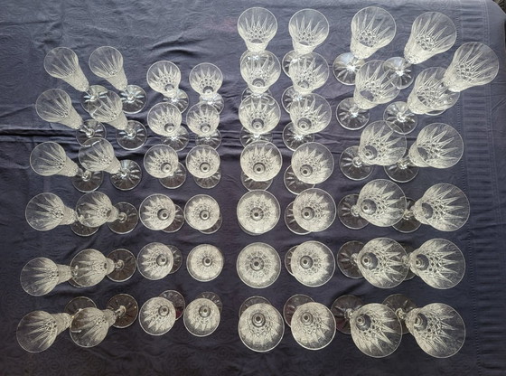 The Cristal Saint Louis Tarn glassware service, comprising an impressive 51 pieces, includes 13 large water glasses, 18 cm tall, perfect for adding a touch of elegance to your meals. It also features 14 wine glasses, 16 cm tall, meticulously crafted to enhance the aroma and flavor of your finest wines. The service further includes 12 liqueur glasses, ideal for enjoying your favorite digestifs with sophistication; and 12 champagne coupes, 18.5 cm tall, perfect for raising a toast at any festive and memorable occasion. In addition, tulip-shaped glasses with star-shaped stems, adorned with twelve pencils, add a captivating visual dimension to this already remarkable collection. These refined pieces are part of the Tarn pattern, designed by the renowned Saint Louis crystalworks, recognized as a supplier to French royalty throughout the centuries. It should be noted that the Saint Louis hallmark has faded on some glasses, lending them a vintage charm, and is slightly visible on others, but overall, they are in excellent condition and have retained their spectacular brilliance. However, it is important to mention that a few glasses show slight marks, evidence of their rich history and use over the years, which contribute to their unique character and timeless appeal.