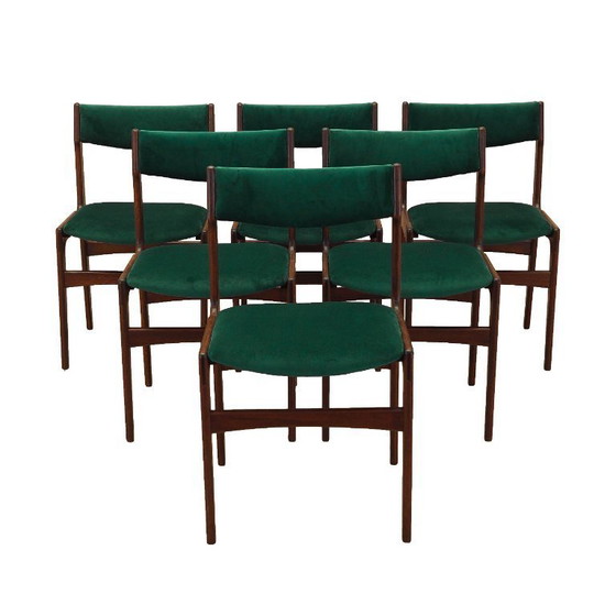 The frame is made of teak wood. The wood has been refreshed. The chairs have new upholstery. The upholstery is green and made of high-quality velour fabric.