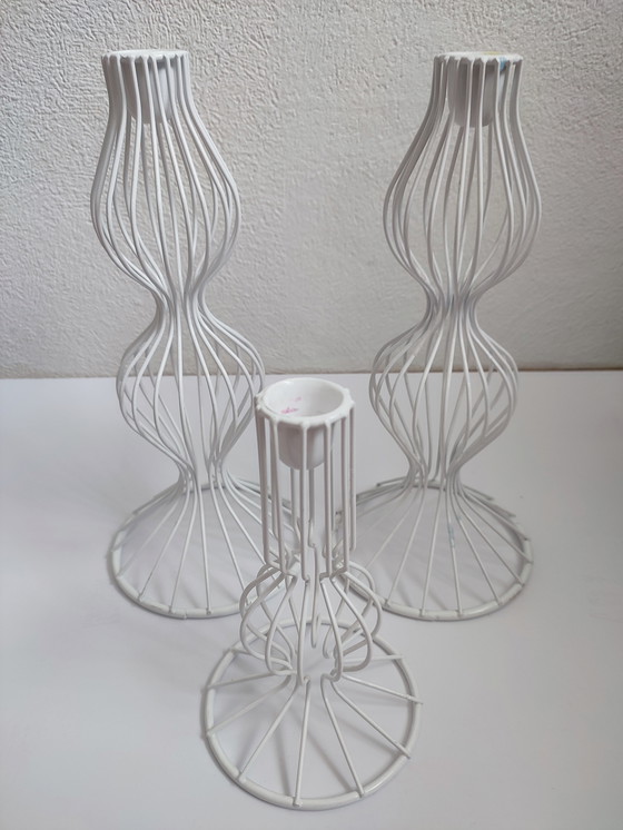 This set of three elegant candlesticks adds a touch of modern sophistication to any interior. The sleek, white wire construction creates an airy look, while the unique design introduces an artistic element.