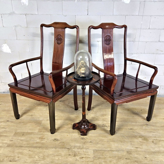 Beautiful set of two vintage Chinese armchairs. The chairs are made of lacquered cherry wood, which has a beautiful warm color and a lovely grain pattern. The set features beautiful wood joints throughout. The construction gives the impression of bamboo. A Chinese pattern is carved into the backrest.
