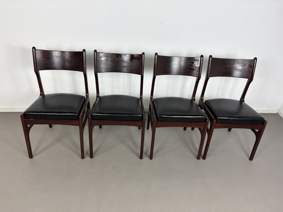Elevate your dining experience with this exquisite set of four vintage dining chairs, crafted from luxurious Palissander wood and upholstered in sleek black skai leather. These chairs exude a timeless elegance, perfect for adding a touch of sophistication to any dining room setting.\n\n- The rich, dark tones of the Palissander wood frame beautifully complement the smooth, black skai leather seats, creating a striking visual contrast.\n- Designed with both comfort and style in mind, these chairs offer a supportive seating experience, ideal for long dinners and gatherings.\n- The vintage design reflects a classic aesthetic, making these chairs a versatile addition to both traditional and contemporary interiors.\n\nInvite these chairs into your home and enjoy the blend of elegance and functionality they bring to your dining space.