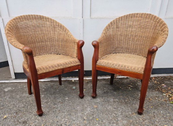 Set van twee koloniale rotan armstoelen uit de jaren 50–60, volledig handgemaakt en gemerkt met een originele atelierstempel onderaan.De stoelen zijn uitgevoerd met een massief houten frame (beuken/mohonie uitstraling) en een met de hand gevlochten rotan zitting en rugleuning.