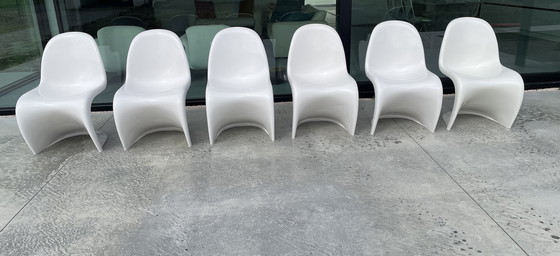 Introducing a distinguished set of six Panton chairs by Herman Miller, a testament to modern design and functionality. These chairs, in pristine white, offer a sleek and timeless aesthetic that seamlessly integrates into any contemporary setting.