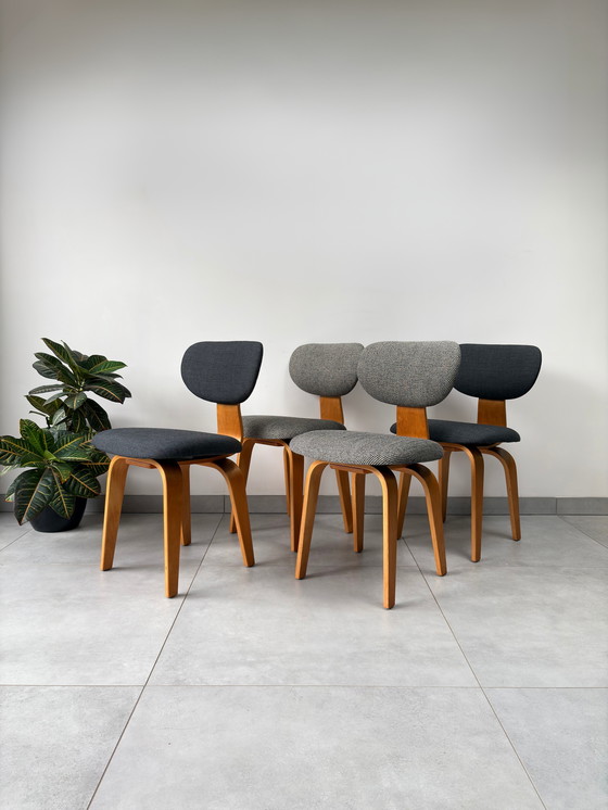 Set of four vintage dining chairs, model SB03, designed by Cees Braakman for Pastoe in the 1950s. Braakman had just returned from a study trip to the US, where he visited Charles & Ray Eames and discovered the magic of bent plywood — not just sawn wood, but sculpted into smooth, organic shapes. He brought that knowledge back to the Netherlands, and you can clearly see it in the elegant, curved birch frames of these chairs.