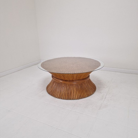 The table is topped with a newly added circular glass top, allowing full appreciation of the intricate bamboo craftsmanship beneath.