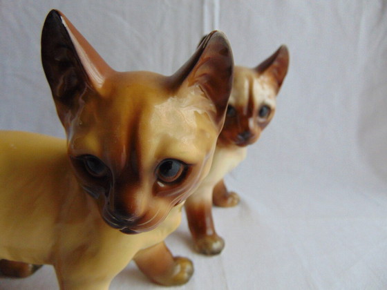 Ceramic Siamese Cats (Twins) made in the 1970s. Width: 16 cm, Height: 14 cm, Depth: 5 cm. No damages. Very nice figurines. Worldwide delivery from the Netherlands. Shipped well packaged in bubble plastic.