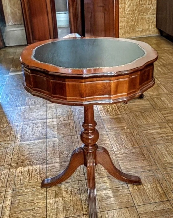 This wood and leather side table is a piece that brings elegance and functionality to any space. Its classic design is complemented by a warm brown wood finish and a green leather surface, creating an attractive visual contrast.