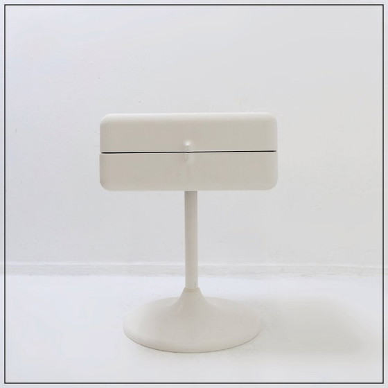 This side table impresses with its subtly protruding drawer handles! With its clean lines, rounded corners, and off-white lacquer, the designers at Lusch GmbH created a decidedly futuristic style! Originally designed as part of a series of modular drawers and shelves (see our other listings), it can also be used on its own.