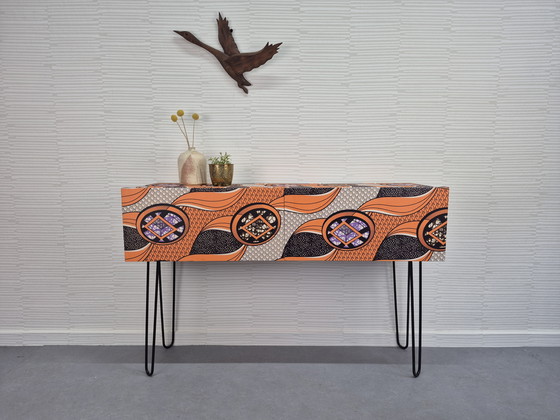 This cabinet/wall cabinet/side table on high black hairpin legs is upholstered in fabric. The fabric has a graphic pattern and an African style. Colors: purple, orange, black, brown, and ecru. The fabric is finished with a varnish for easy cleaning. Note: Only one door can be opened at a time. Otherwise, the cabinet will fall forward. To prevent this, it's best to mount the cabinet to the wall using the holes in the back panel. This is no longer an issue when there's weight in or on the cabinet. In good vintage condition.