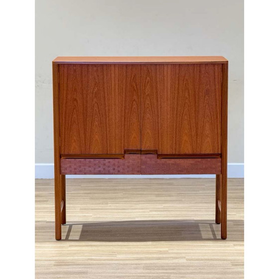 This elegantly designed drink cabinet or tall sideboard, crafted by Tom Robertson for A.H. McIntosh in the early 1970s in Scotland, is a stunning addition to any space. The piece showcases exquisite craftsmanship in its teak veneer drawers and highlights the beautiful grain of its doors.