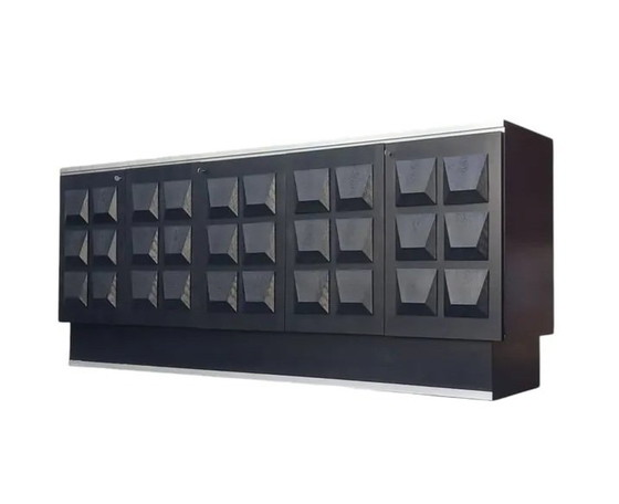 This stunning black Brutalist sideboard, attributed to De Coene, is a bold piece that embodies the essence of Brutalist design. Crafted with strong geometric motifs on its doors, this piece showcases the architectural influence and masterful craftsmanship associated with De Coene.